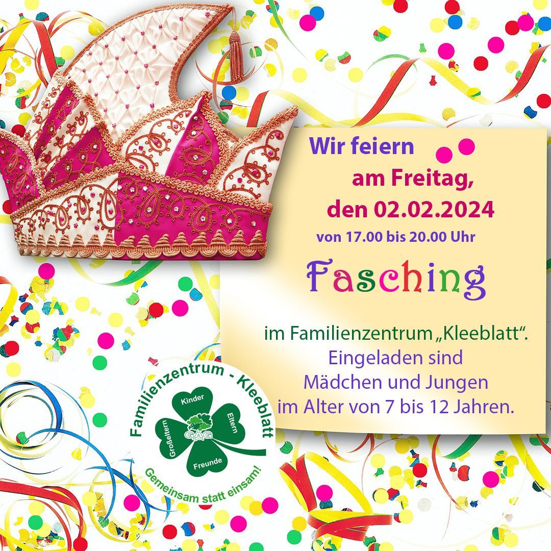 Wir laden herzlich ein zur ultimativen Faschingsfeier am 02.02.2024, von 17 bis 20 Uhr im Familienzentrum "Kleeblatt"! 🥳🎊