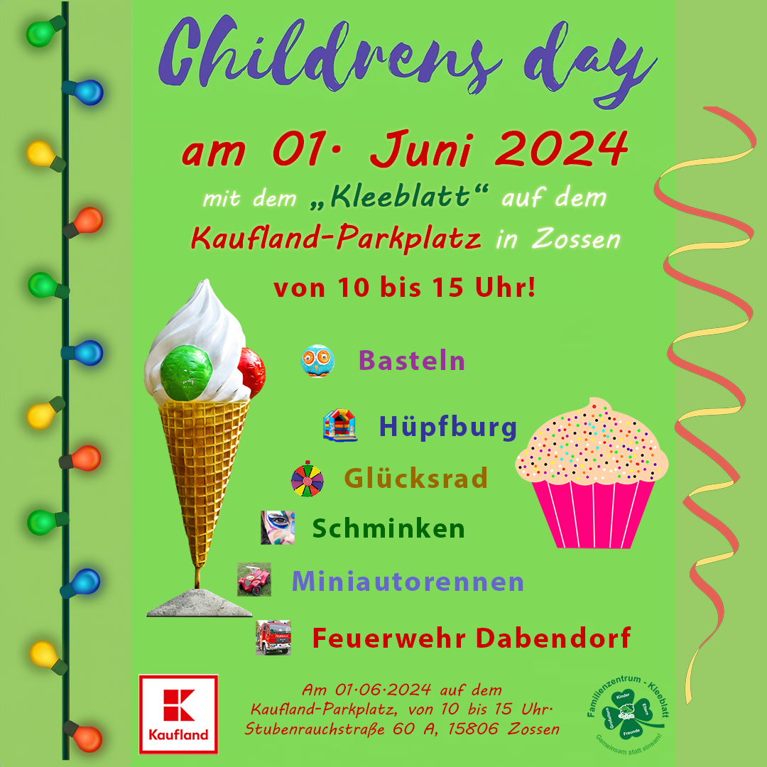 am 1. Juni 2024 feiern wir gemeinsam den Kindertag in Zossen! Kommt vorbei und erlebt einen unvergesslichen Tag voller Spaß und Abenteuer.