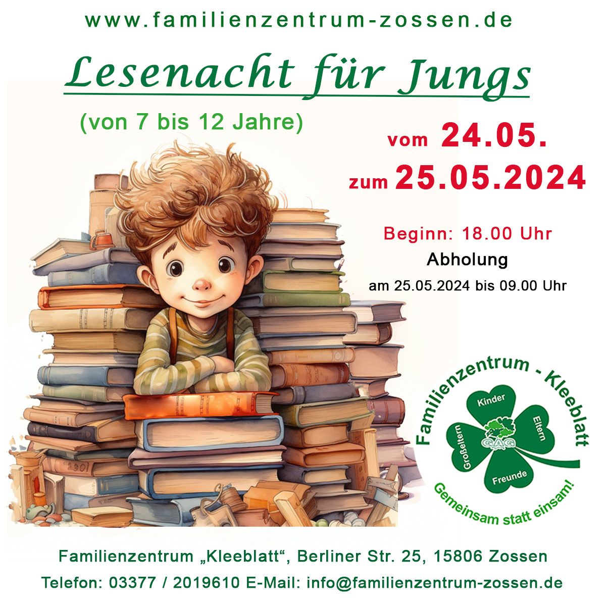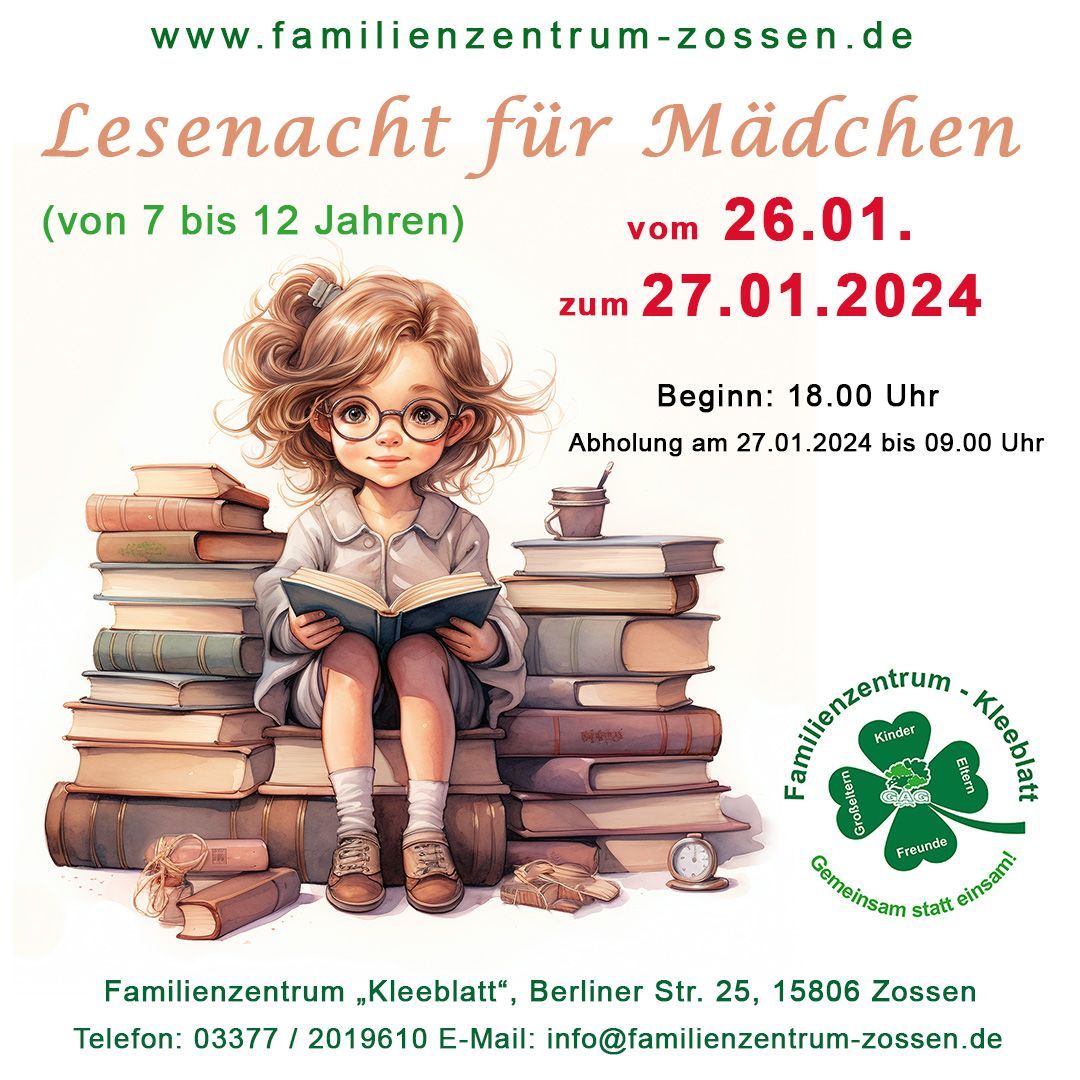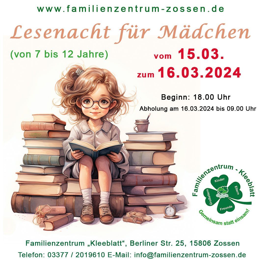Dann haben wir das perfekte Event für dich! Komm zur nächsten Lesenacht im Familienzentrum „Kleeblatt“ nach Zossen.