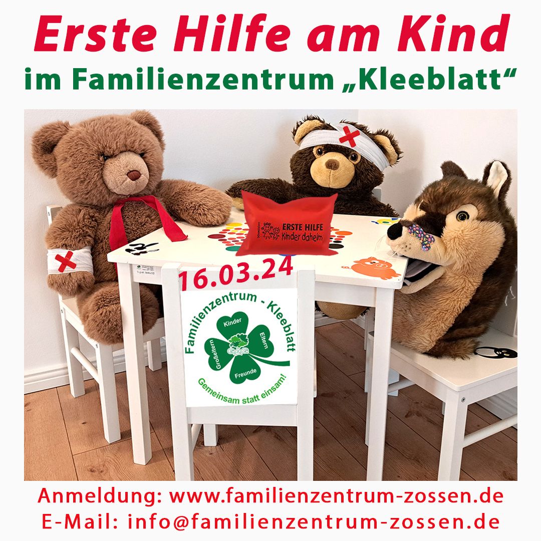 Erste Hilfe am Kind – kompakt: Du hast Dein erstes Kind bekommen bzw. Du willst vorbereitet sein und Dich sicherer fühlen? Dann sei dabei, wenn es um die Themen wie „Lebensrettende Sofortmaßnahmen, Verschlucken, Vergiftungen, Versorgung lebensbedrohlicher Verletzungen, Fieberkrampf und Pseudokrupp geht. Wann? Am 16.03.2024 von 10.00 bis 13.30 Uhr. Wo? Im Familienzentrum „Kleeblatt“, Berliner Str. 25, 15806 Zossen. Was musst Du tun um dabei zu sein? Fülle das Anmeldeformular auf www.familienzentrum-zossen.de aus oder ruf an 03377 2019610! Die Veranstaltung findet in Kooperation mit dem Netzwerk Gesunde Kinder und Donatella Bona, Gelbes Pflaster statt.